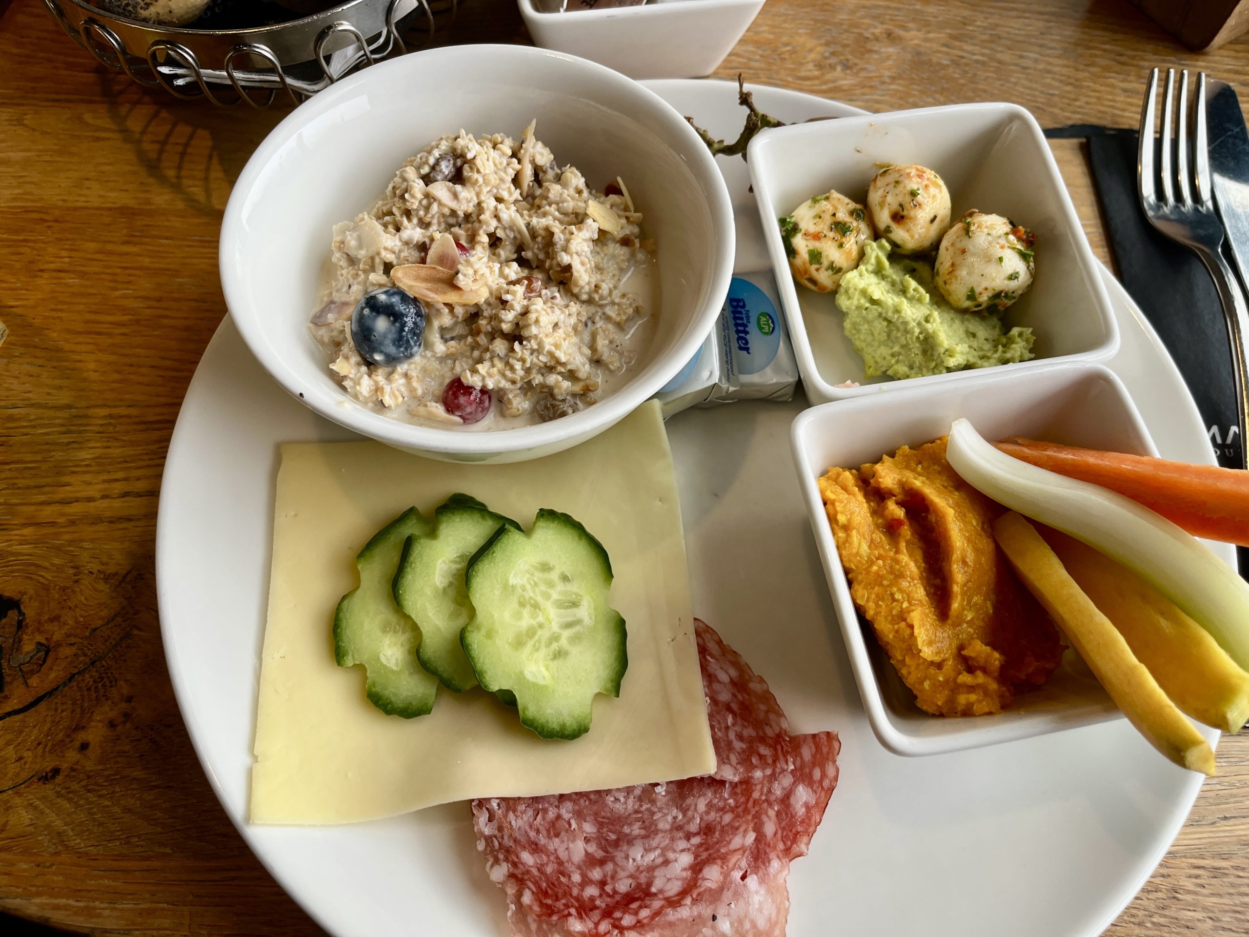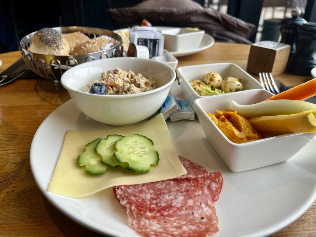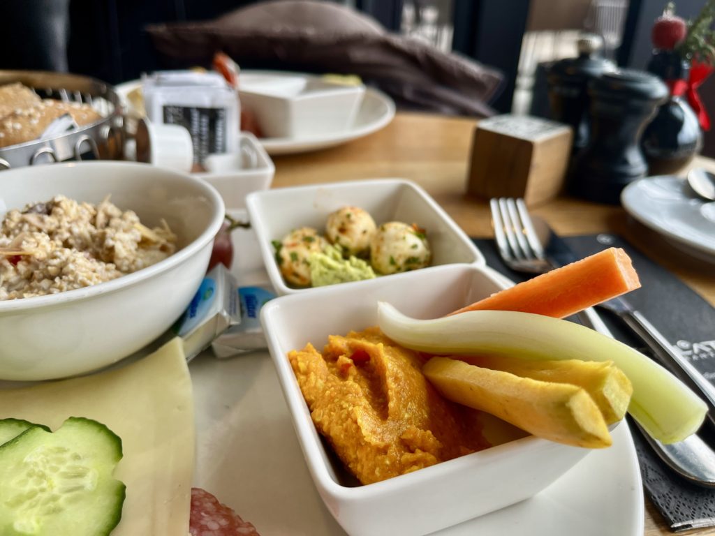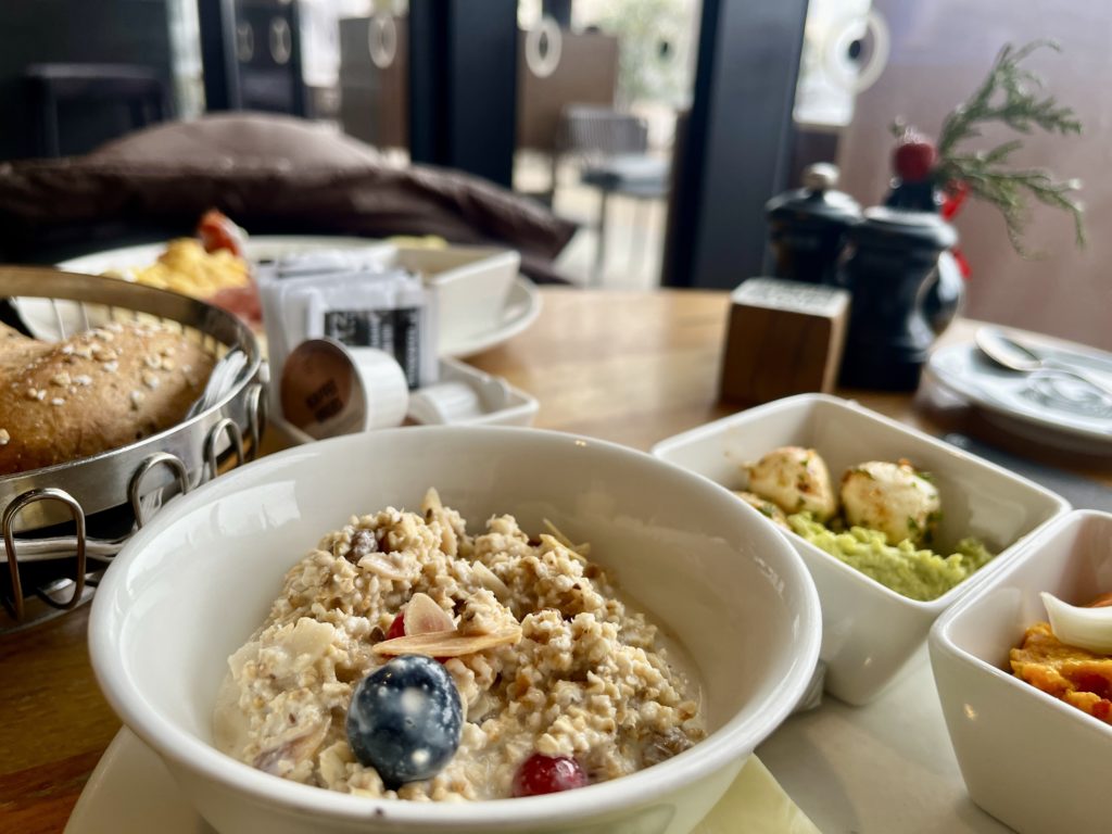 Das Frühstücksbuffet ist klassisch aufgebaut, aber genau das macht seinen Charme aus. Hier gibt es einfach alles, was man sich von einem ausgiebigen Frühstück wünscht. Frisches Gebäck in verschiedenen Varianten, Müsli, Wurst, Käse und eine große Auswahl an Aufstrichen – viele davon auch vegan und sogar Kuchen für alle, die es morgens gern etwas süßer mögen.